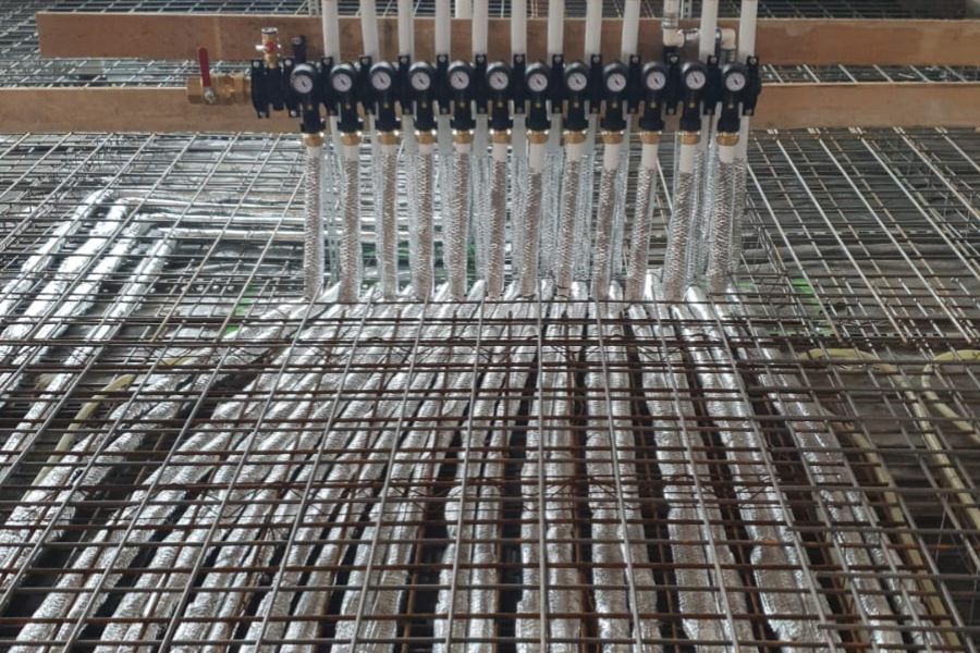 Eine Verwendung von gewelltem Schutzrohr etwa bereitet schon deshalb Probleme, weil man dadurch die Betonüberdeckung erhöhen müsste und damit einen Höhenabsatz in der Bodenfläche der Wohnung hätte. Zudem erbringen Schutzrohre nicht den erforderlichen Wärmedämmeffekt, sind zu dick zum Festtackern und passen nicht in eine Noppenplatte. Die Räume zwischen den zu dämmenden Heizrohren werden mit der EvoTherm Wärmerückstrahlfolie vollflächig bedeckt.